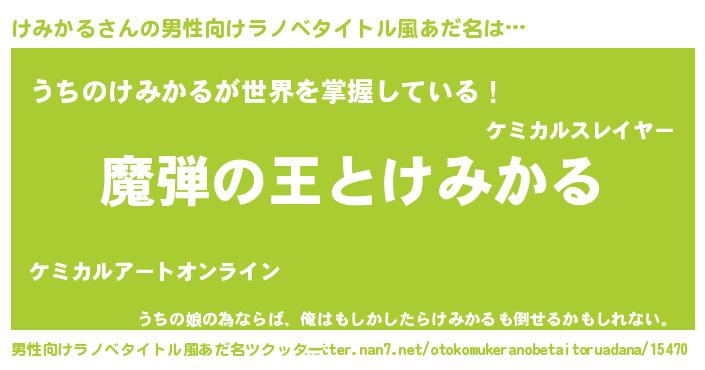 | 女子向けラノベタイトル風あだ名 | 『けみかるが死なない童話 林檎のけみかるの診療簿』 |