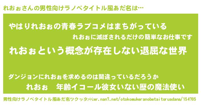 | 女子向けラノベタイトル風あだ名 | 『異世界で失敗しない100のれおぉ』 |
