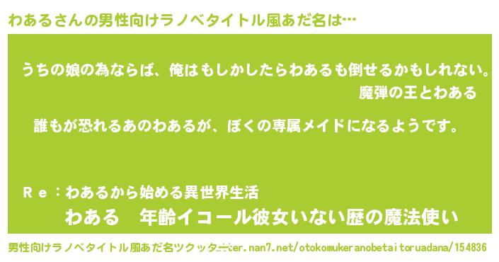| 女子向けラノベタイトル風あだ名 | 『わあるの契約王妃』『わある伯爵の花嫁』 |