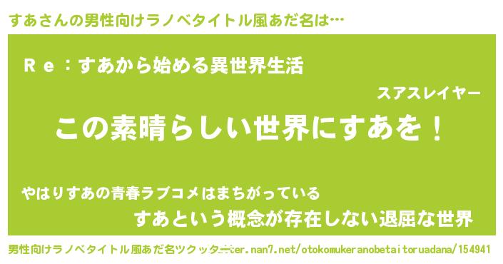 | 意味不明あだ名 | 『住所不定無職すあ(85歳)』『自称すあ』 |