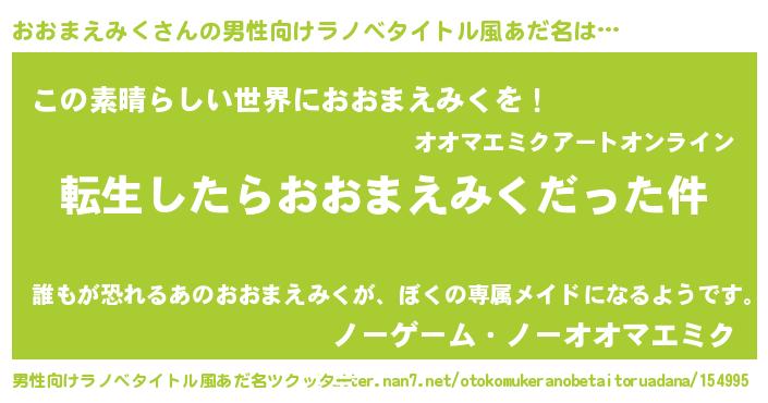 | 女子向けラノベタイトル風あだ名 | 『おおまえみくの玉の輿計画!』 |