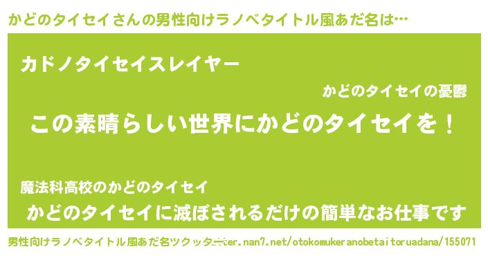 | 女子向けラノベタイトル風あだ名 | 『悪役かどのタイセイに転生したようですが、知った事ではありません』 |