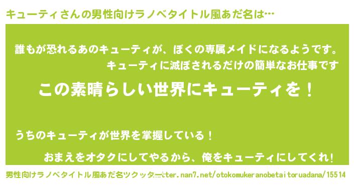 | 女子向けラノベタイトル風あだ名 | 『悪役キューティに転生したようですが、知った事ではありません』 |