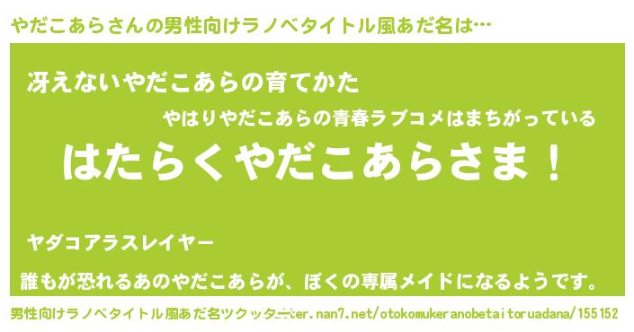 | 胡散臭い通販商品みたいなあだ名 | 『絶対に幸福をもたらす招き猫…その名も「やだこあら」』 |