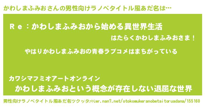 | 女子向けラノベタイトル風あだ名 | 『かわしまふみおの雑貨屋さん』 |