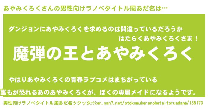 | 女子向けラノベタイトル風あだ名 | 『乙女ゲームの破滅フラグしかない悪役あやみくろくに転生してしまった…』 |