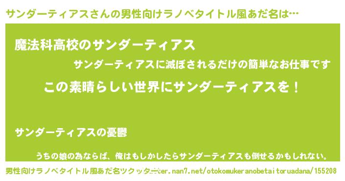 | 胡散臭い通販商品みたいなあだ名 | 『あなたにだけ特別に提供する100年もののヴィンテージワイン…その名も「サンダーティアス」』 |