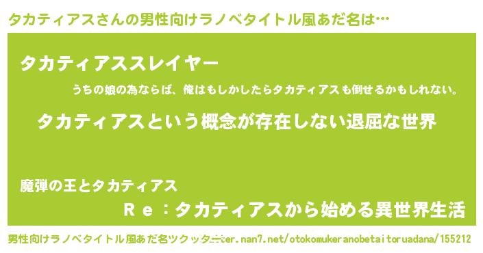 | 女子向けラノベタイトル風あだ名 | 『異世界で失敗しない100のタカティアス』 |