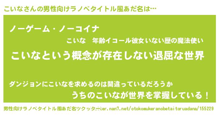 | 女子向けラノベタイトル風あだ名 | 『こいなの契約王妃』『死神こいなの再婚』 |