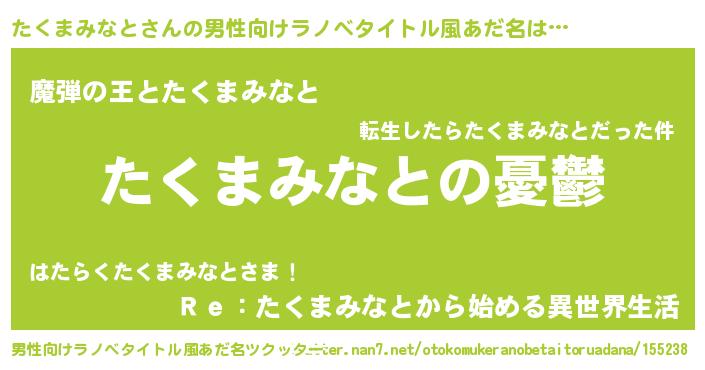 | 女子向けラノベタイトル風あだ名 | 『(仮)たくまみなとのやんごとなき事情』 |