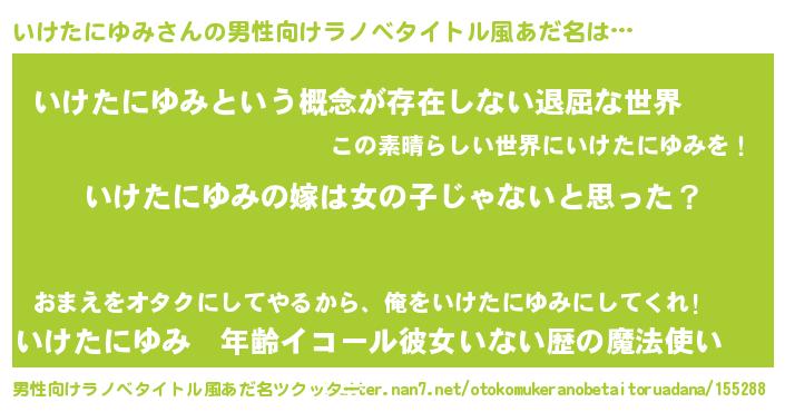 | 女子向けラノベタイトル風あだ名 | 『いけたにゆみの卵を拾いまして』 |