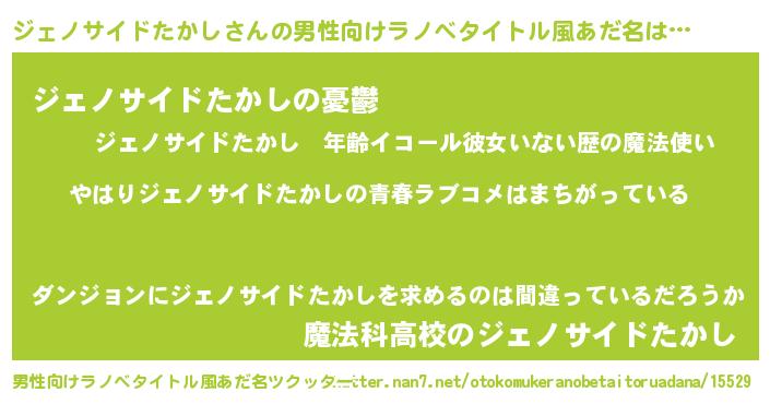 | 女子向けラノベタイトル風あだ名 | 『ジェノサイドたかしの雑貨屋さん』 |