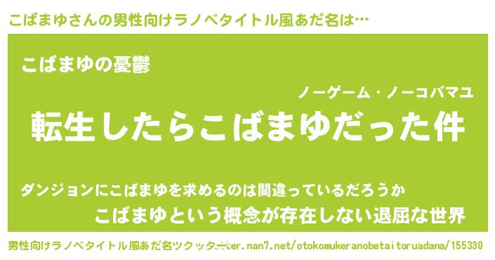 | 女子向けラノベタイトル風あだ名 | 『こばまゆの玉の輿計画!』 |