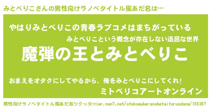 | 胡散臭い通販商品みたいなあだ名 | 『世界中を虜にした100年もののヴィンテージワイン…その名も「みとべりこ」』 |