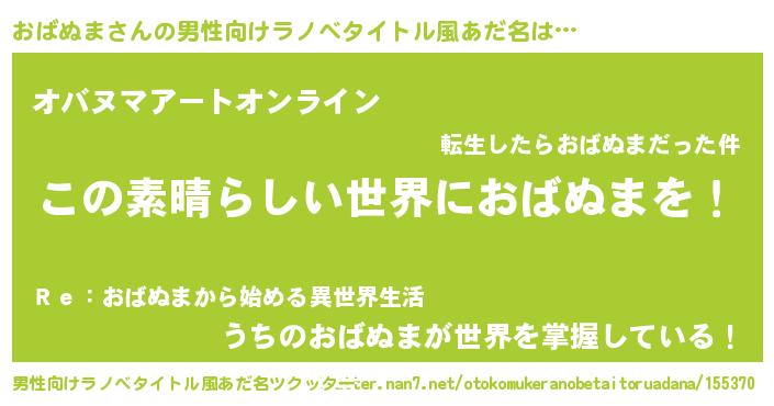 | 女子向けラノベタイトル風あだ名 | 『悪役おばぬまに転生したようですが、知った事ではありません』 |