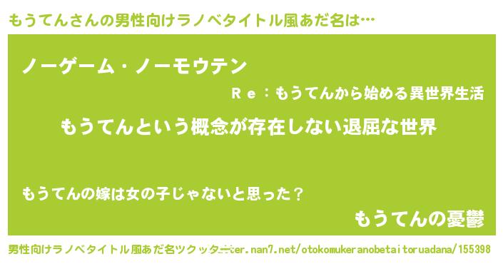| 女子向けラノベタイトル風あだ名 | 『もうてんの契約王妃』『闇のもうてん』 |