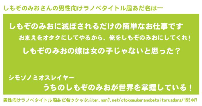 | 女子向けラノベタイトル風あだ名 | 『しもぞのみおの卵を拾いまして』 |