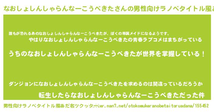 | 胡散臭い通販商品みたいなあだ名 | 『前代未聞の健康食品…その名も「なおしょしんしゃらんなーこうべきた」』 |
