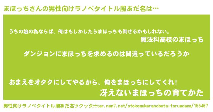 | 胡散臭い通販商品みたいなあだ名 | 『信頼と実績のサプリメント…その名も「まほっち」』 |