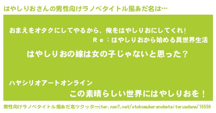 | ヒーロー風カッコイイあだ名 | 『炎刃騎士ハヤ』『慈愛の使者はやしりお』 |