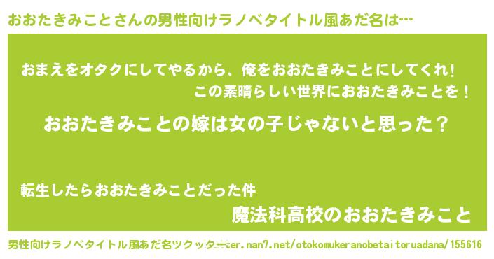 | 女子向けラノベタイトル風あだ名 | 『おおたきみことの卵を拾いまして』 |