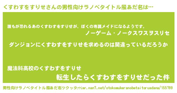 | 胡散臭い通販商品みたいなあだ名 | 『信頼と実績のサプリメント…その名も「くすわすをすりせ」』 |