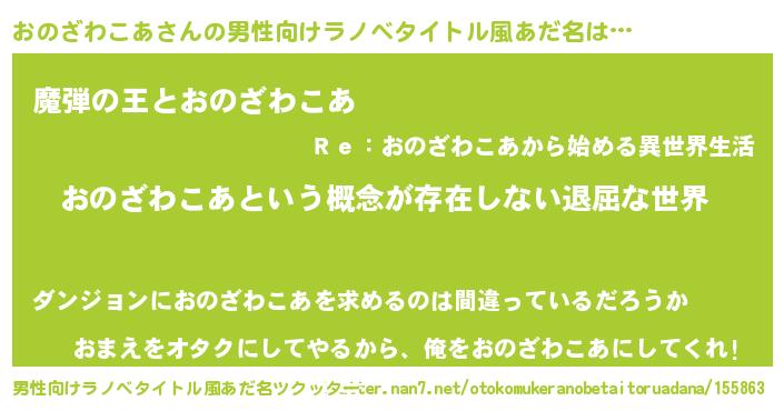 | 女子向けラノベタイトル風あだ名 | 『異世界で失敗しない100のおのざわこあ』 |