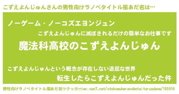| 女子向けラノベタイトル風あだ名 | 『こずえよんじゅんなんてお断りですっ。』 |