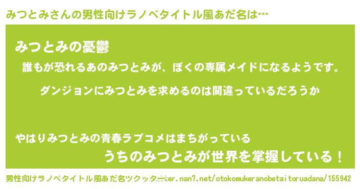 | 女子向けラノベタイトル風あだ名 | 『みつとみの卵を拾いまして』 |