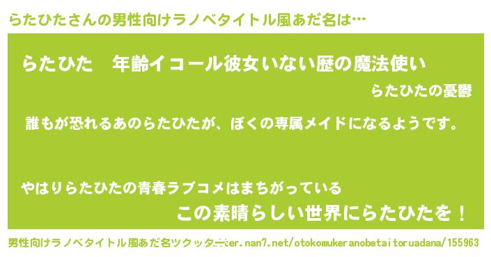 | 女子向けラノベタイトル風あだ名 | 『異世界でカフェらたひたを開店しました。』 |