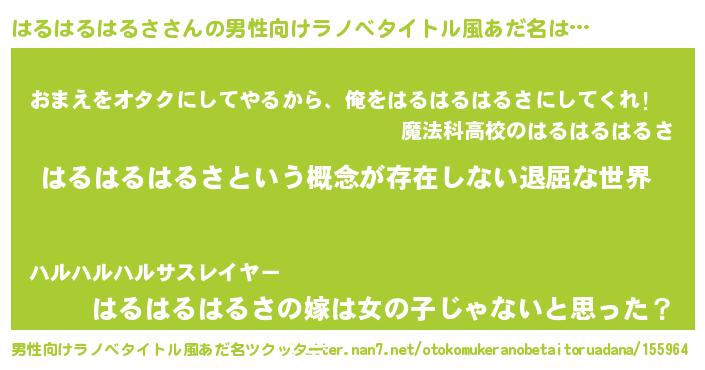 | 女子向けラノベタイトル風あだ名 | 『異世界で失敗しない100のはるはるはるさ』 |