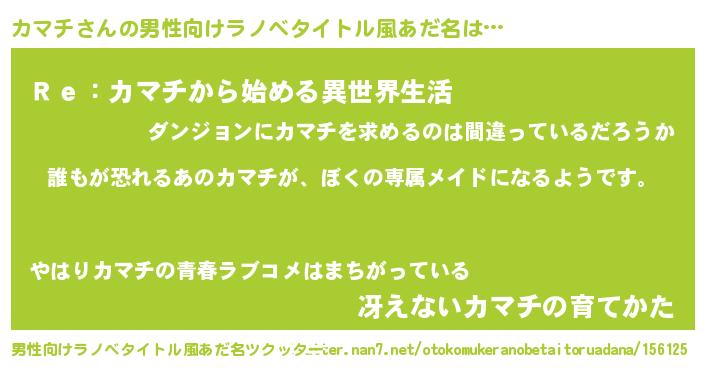 | 女子向けラノベタイトル風あだ名 | 『カマチの契約王妃』『闇のカマチ』 |