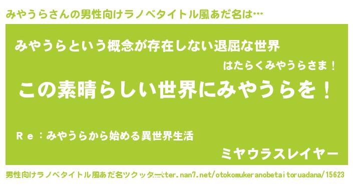 | 女子向けラノベタイトル風あだ名 | 『悪役みやうらに転生したようですが、知った事ではありません』 |