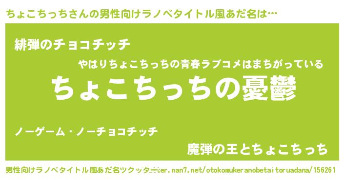 | 女子向けラノベタイトル風あだ名 | 『(仮)ちょこちっちのやんごとなき事情』 |
