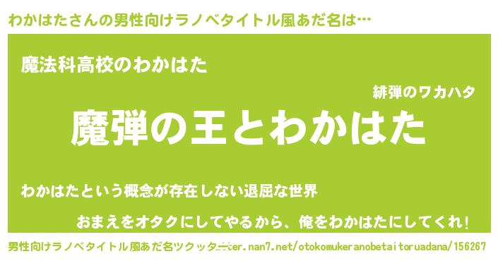| 女子向けラノベタイトル風あだ名 | 『乙女ゲームの破滅フラグしかない悪役わかはたに転生してしまった…』 |