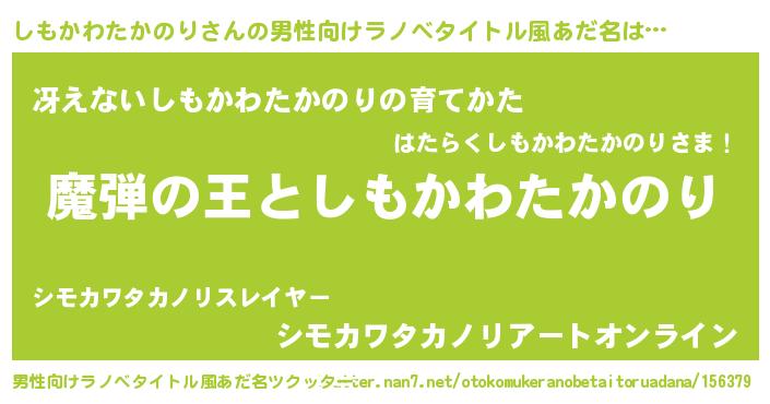 | 女子向けラノベタイトル風あだ名 | 『しもかわたかのりが死なない童話 林檎のしもかわたかのりの診療簿』 |