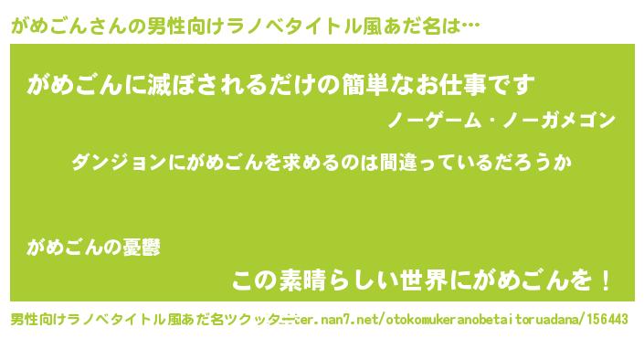 | 女子向けラノベタイトル風あだ名 | 『がめごんの卵を拾いまして』 |