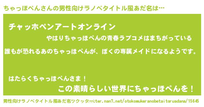 | 女子向けラノベタイトル風あだ名 | 『異世界でカフェちゃっほぺんを開店しました。』 |