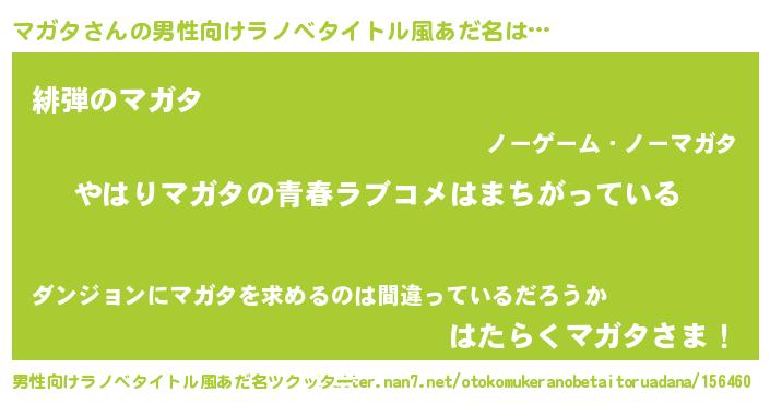 | 女子向けラノベタイトル風あだ名 | 『マガタの雑貨屋さん』『マガタ恋絵巻』 |