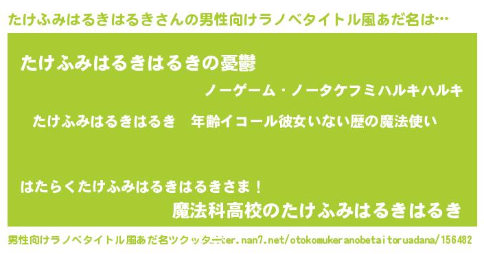 | 女子向けラノベタイトル風あだ名 | 『たけふみはるきはるきの玉の輿計画!』 |