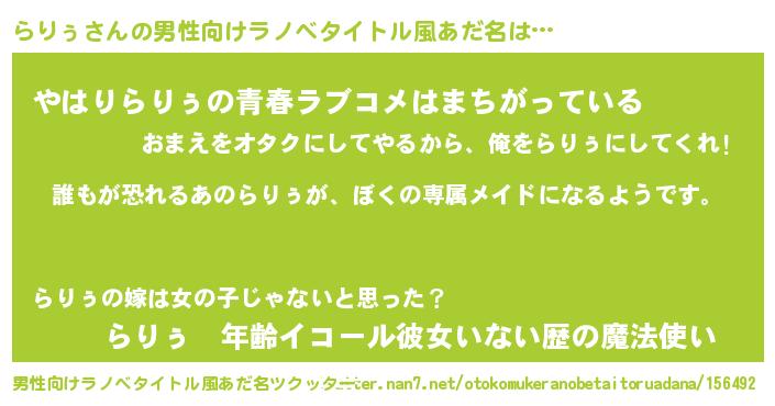 | 女子向けラノベタイトル風あだ名 | 『らりぅの契約王妃』『らりぅ様がみてる』 |