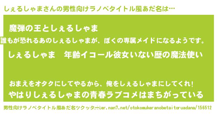 | 女子向けラノベタイトル風あだ名 | 『しぇるしゃまの玉の輿計画!』 |