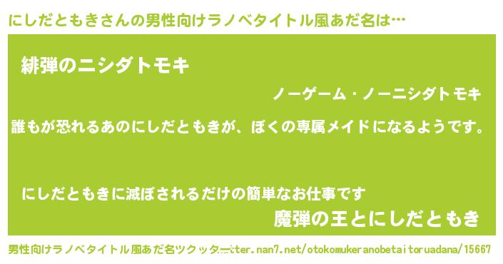 | ヘコむあだ名 | 『にしだともき(笑)』『にしにゅー』 |