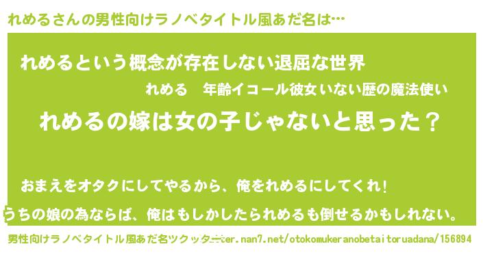 | 女子向けラノベタイトル風あだ名 | 『れめるの卵を拾いまして』 |