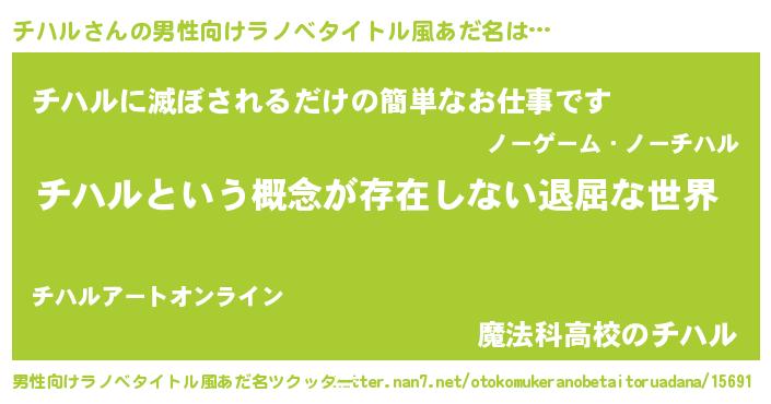 | 女子向けラノベタイトル風あだ名 | 『異世界で失敗しない100のチハル』 |