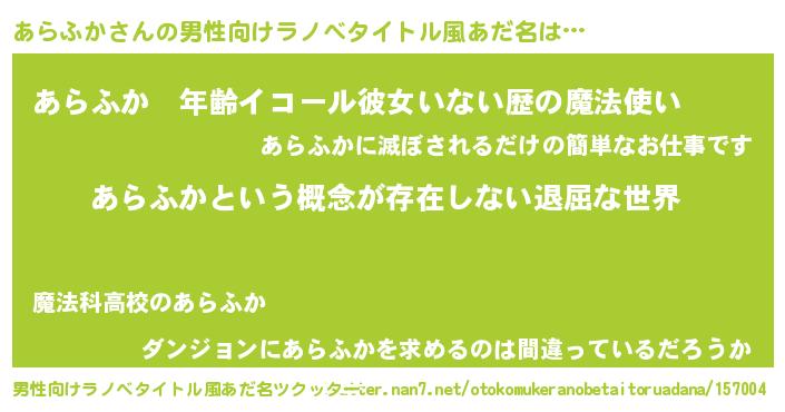 | 女子向けラノベタイトル風あだ名 | 『異世界で失敗しない100のあらふか』 |