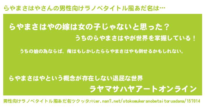 | 女子向けラノベタイトル風あだ名 | 『らやまさはや伯爵の花嫁』 |
