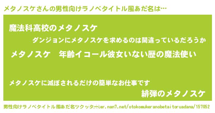 | 女子向けラノベタイトル風あだ名 | 『メタノスケの玉の輿計画!』 |