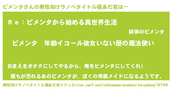 | 女子向けラノベタイトル風あだ名 | 『ピメンタの玉の輿計画!』 |