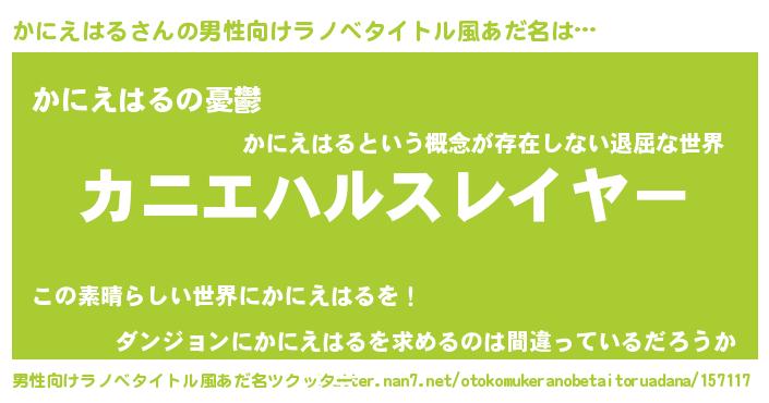 | 胡散臭い通販商品みたいなあだ名 | 『必ず成功する霊験あらたかなお札…その名も「かにえはる」』 |